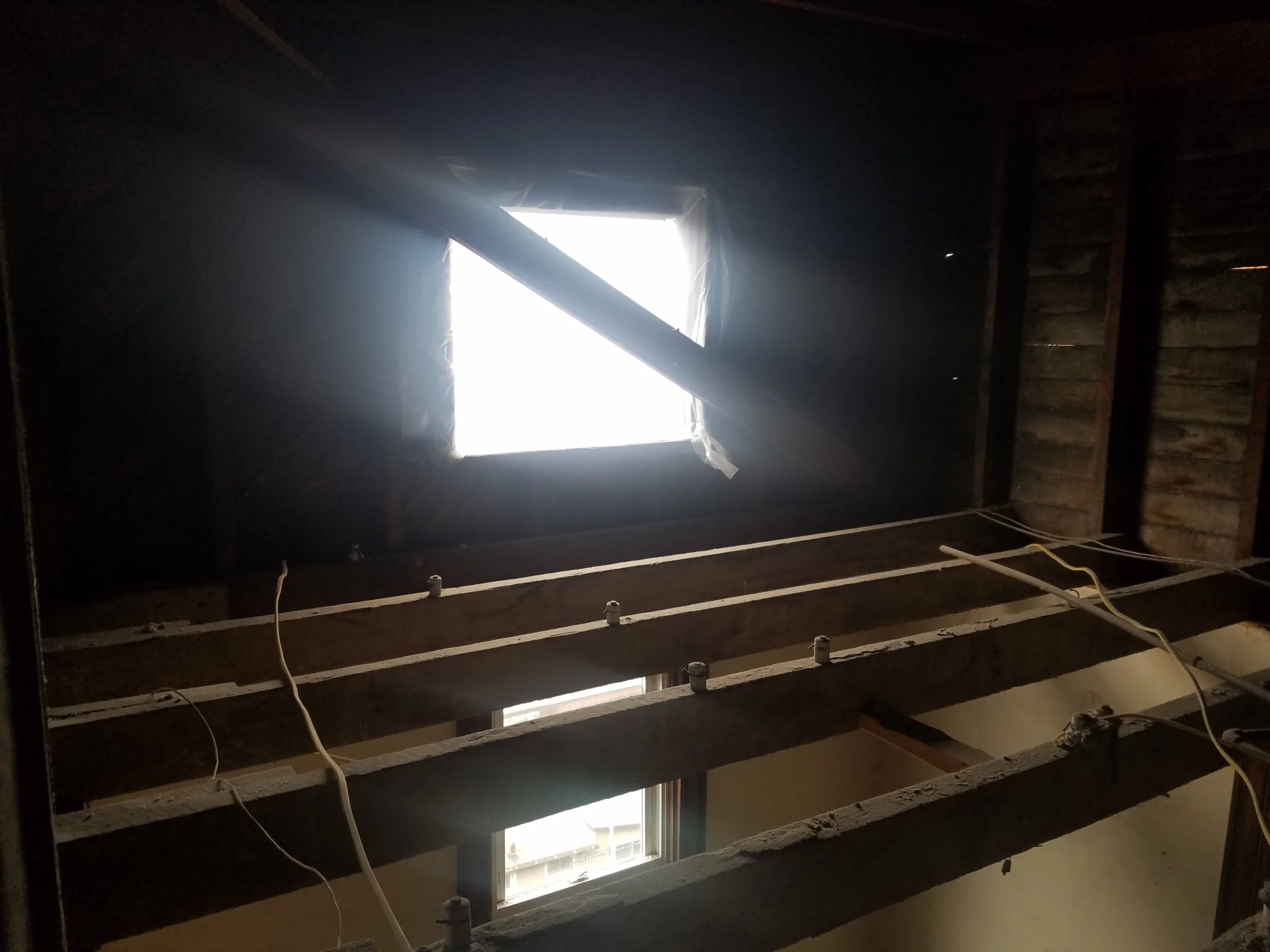 We took out all of the ceilings in the front space and it opens up the upper windows. Not sure why they had natural light into the crawl space originally. We plan to keep the front part open and expose the beams and then put in a loft space towards the back.